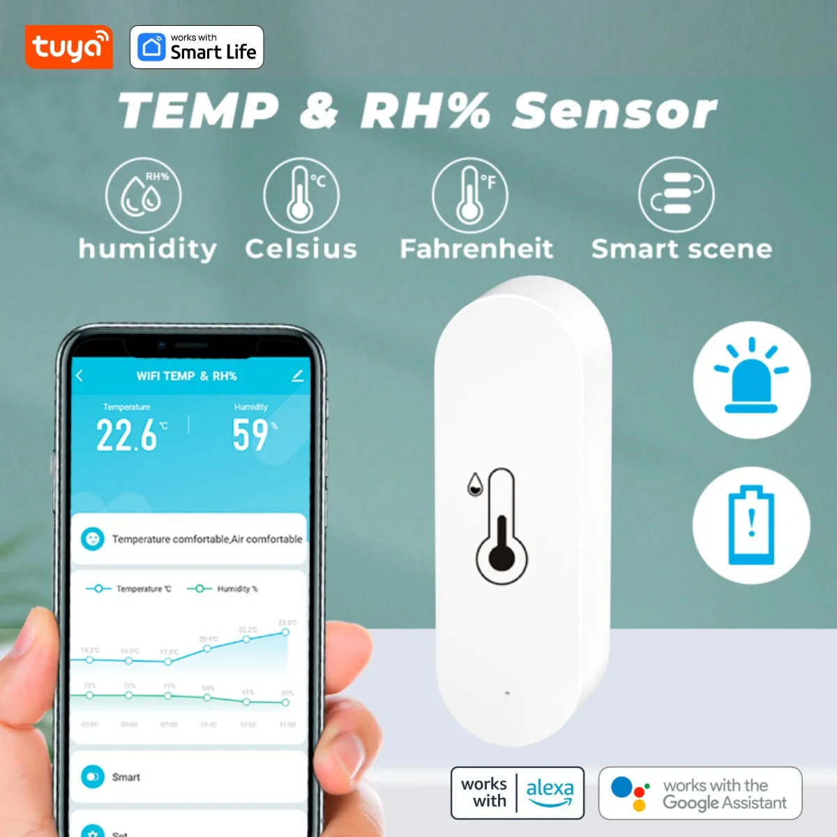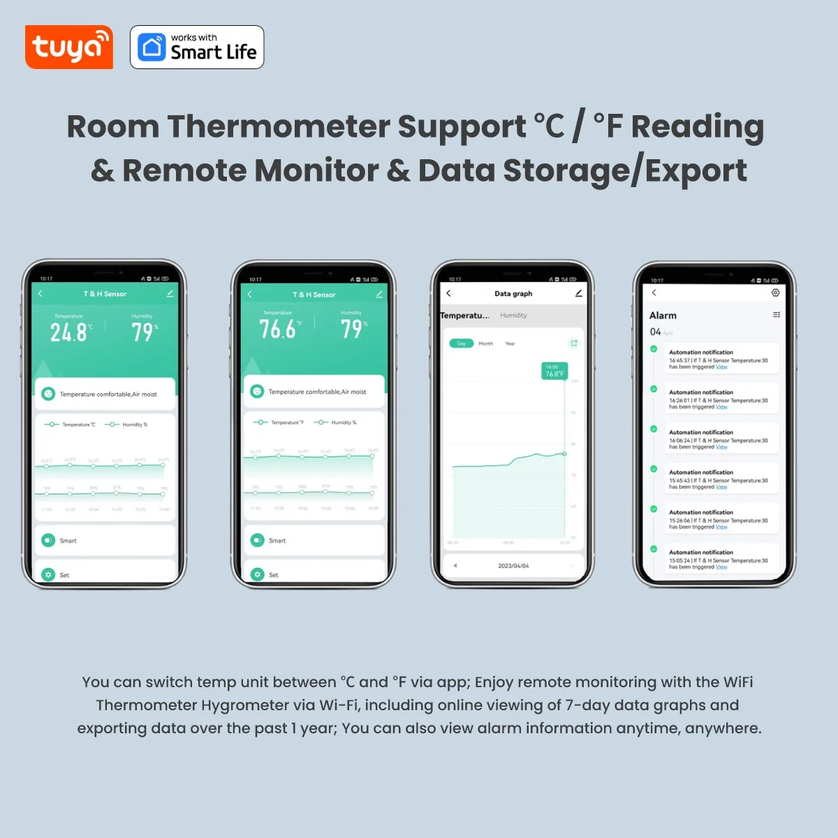 - Alertas automáticos: Configure limites personalizados para a temperatura e humidade, e receba notificações instantâneas no seu telemóvel.